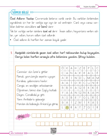 1. Aşağıdaki cümlelerde geçen özel adları harf tablosundan bulup boyayalım.
