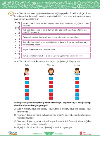 C) Toprak’ın doğru boyadığı kutucuk sayısı, Irmak ile Ada’nın doğru boyadığı ku-