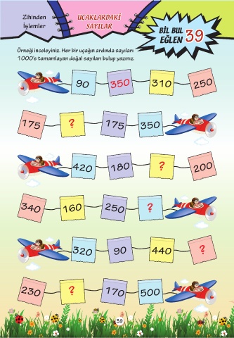 Zihinden UÇAKLARDAKİ İşlemler SAYILAR BİL BUL 39 EĞLEN Örneği inceleyiniz. Her bir uçağın ardında sayıları 1000’e tamamlayan doğal sayıları bulup yazınız. 90 350 310 250 ? 175 175 350 420 180 ? 200 160 250 340 ? 320 90 440 ? ? 230 170 500 39