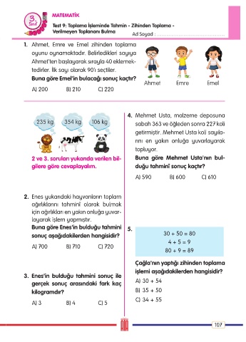 Test 9: Toplama İşleminde Tahmin - Zihinden Toplama -
