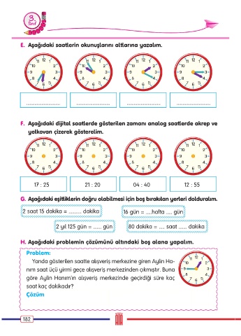 E. Aşağıdaki saatlerin okunuşlarını altlarına yazalım.