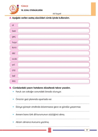 A. Aşağıda verilen sesteş sözcükleri cümle içinde kullanalım.