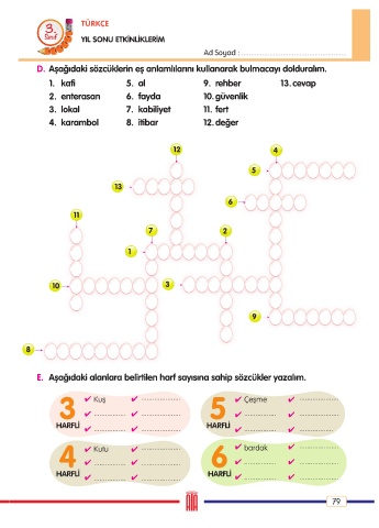 D. Aşağıdaki sözcüklerin eş anlamlılarını kullanarak bulmacayı dolduralım.