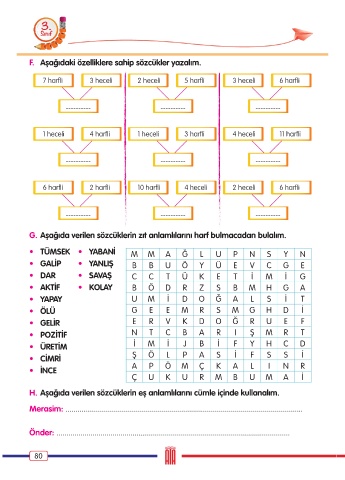F. Aşağıdaki özelliklere sahip sözcükler yazalım.