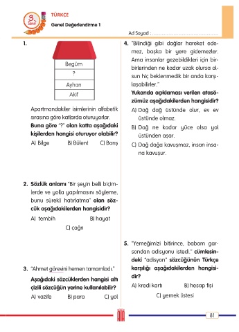 Apartmandakiler isimlerinin alfabetik A) Dağ dağ üstünde olur, ev ev