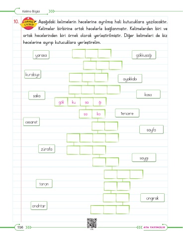 10. Aşağıdaki kelimelerin hecelerine ayrılmış hali kutucuklara yazılacaktır.