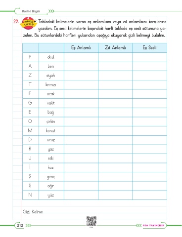 29. Tablodaki kelimelerin varsa eş anlamlısını veya zıt anlamlısını karşılarına