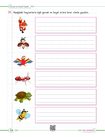 20. Aşağıdaki hayvanlarla ilgili gerçek ve hayal ürünü birer cümle yazalım.