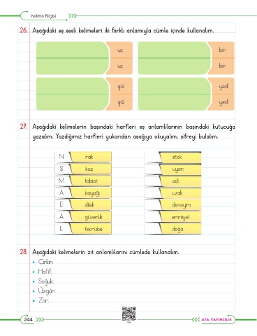 26. Aşağıdaki eş sesli kelimeleri iki farklı anlamıyla cümle içinde kullanalım.