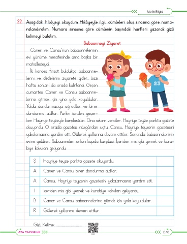 22. Aşağıdaki hikâyeyi okuyalım Hikâyeyle ilgili cümleleri oluş sırasına göre numa-