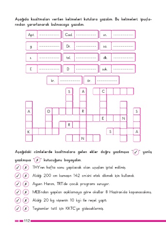Aşağıda kısaltmaları verilen kelimeleri kutulara yazalım. Bu kelimeleri, ipuçla-