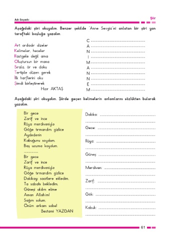 Aşağıdaki şiiri okuyalım. Şiirde geçen kelimelerin anlamlarını sözlükten bularak