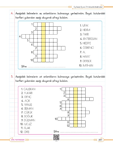 5. Aşağıdaki kelimelerin zıt anlamlılarını bulmacaya yerleştirelim. Boyalı kutulardaki