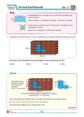 Buna göre boyalı bölgenin çevre uzunluğu 280 cm’dir.