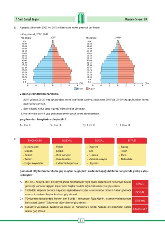 6. Aşağıda ülkemizin 2007 ve 2019 yıllarına ait nüfus piramidi verilmiştir.
