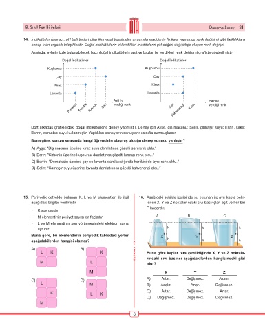 Dört arkadaş grafiklerdeki doğal indikatörlerle deney yapmıştır. Deney için Ayşe, diş macunu; Selin, çamaşır suyu; Ecrin, sirke;