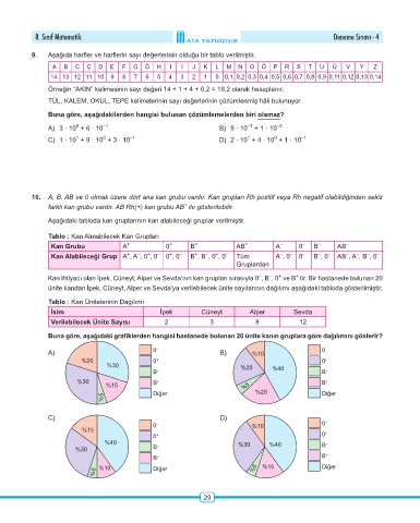 9. Aşağıda harfler ve harflerin sayı değerlerinin olduğu bir tablo verilmiştir.