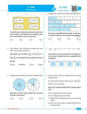 3. Aşağıda eş daire dilimleriyle bir kesir modellenmiştir. 6. Ahmet, Hilal ve Salih, aynı hikâye kitabını okumaya