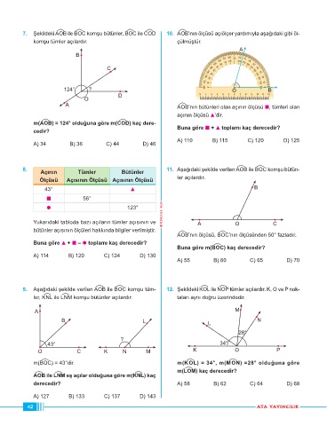 7. Şekildeki AéOB ile BéOC komşu bütünler, BéOC ile CéOD 10. AéOB’nın ölçüsü açıölçer yardımıyla aşağıdaki gibi öl-