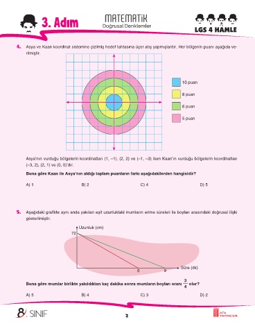 4. Asya ve Kaan koordinat sistemine çizilmiş hedef tahtasına üçer atış yapmışlardır. Her bölgenin puanı aşağıda ve-