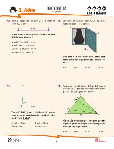 13. Belirli bir üçgen çizmek isteyen Doruk cetvel ile 10 15. Genişliği 30 cm olan pencerede ABA noktaları doğ-