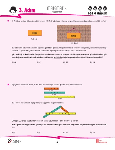 7. 1. Şekil’de verilen dikdörtgen biçimindeki “GİRİŞ” tabelasının kenar uzunlukları aralarında asal ve alanı 120 cm dir.