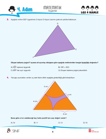 3. Aşağıda verilen DEF üçgeninde E köşesi D köşesi üzerine gelecek şekilde katlanıyor.