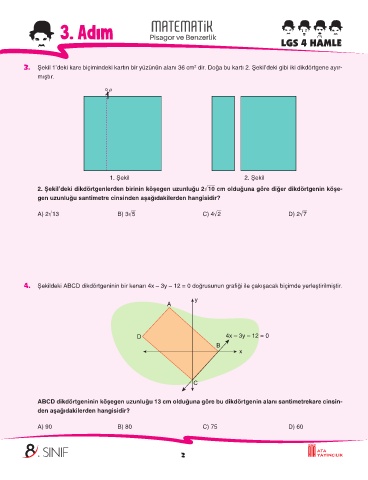 3. Şekil 1’deki kare biçimindeki kartın bir yüzünün alanı 36 cm dir. Doğa bu kartı 2. Şekil’deki gibi iki dikdörtgene ayır-