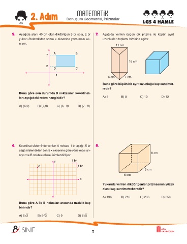 5. Aşağıda alanı 40 br olan dikdörtgen 3 br sola, 2 br 7. Aşağıda verilen üçgen dik prizma ile küpün ayrıt