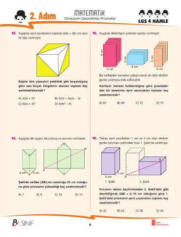 14. Aşağıda dik üçgen dik prizma ve açınımı verilmiştir. 16. Taban ayrıt uzunlukları 1 cm ve 2 cm olan dikdört-