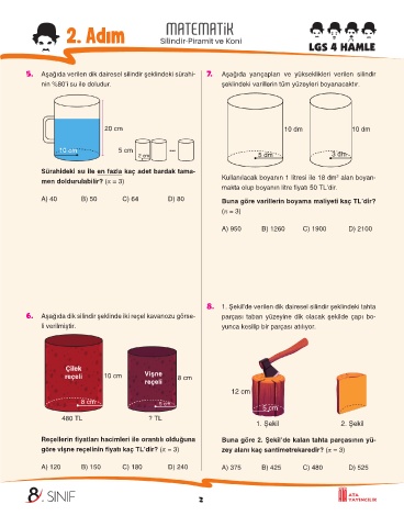 5. Aşağıda verilen dik dairesel silindir şeklindeki sürahi- 7. Aşağıda yarıçapları ve yükseklikleri verilen silindir