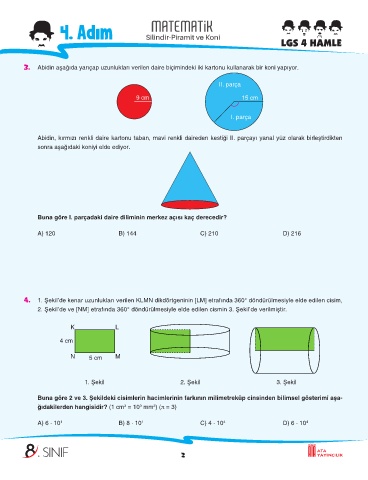 3. Abidin aşağıda yarıçap uzunlukları verilen daire biçimindeki iki kartonu kullanarak bir koni yapıyor.