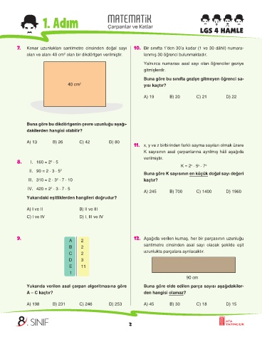 7. Kenar uzunlukları santimetre cinsinden doğal sayı 10. Bir sınıfta 1’den 30’a kadar (1 ve 30 dâhil) numara-