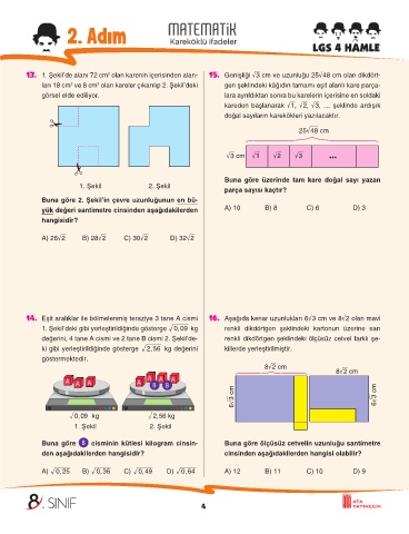 13. 1. Şekil’de alanı 72 cm olan karenin içerisinden alan- 15. Genişliği §3 cm ve uzunluğu 25æ48 cm olan dikdört-