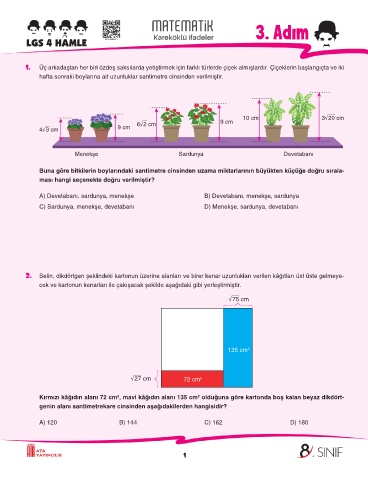 1. Üç arkadaştan her biri özdeş saksılarda yetiştirmek için farklı türlerde çiçek almışlardır. Çiçeklerin başlangıçta ve iki