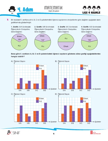 7. Bir okuldaki 5. sınıflara ait A, B, C ve D şubelerindeki öğrenci sayılarının cinsiyetlerine göre dağılımı aşağıdaki daire