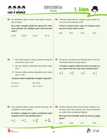13. Bir sınıftaki kız öğrenci sayısı erkek öğrenci sayısın- 16. Yekta’nın kalemlerinden rastgele seçilen birinin kır-