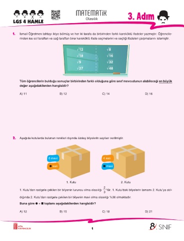 1. İsmail Öğretmen tahtayı ikiye bölmüş ve her iki tarafa da birbirinden farklı kareköklü ifadeler yazmıştır. Öğrencile-