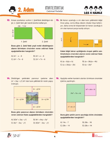 13. Kenar uzunlukları verilen 1. Şekil’deki dikdörtgen kâ- 15. Bir kenar uzunluğu a cm olan kare şeklindeki kâğıt
