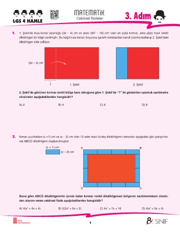 1. 1. Şekil’de kısa kenar uzunluğu (3x – 4) cm ve alanı (9x – 16) cm olan ön yüzü kırmızı, arka yüzü mavi renkli