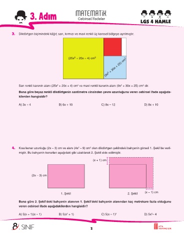4. Kısa kenar uzunluğu (2x – 3) cm ve alanı (4x – 9) cm olan dikdörtgen şeklindeki bahçenin görseli 1. Şekil’de veril-