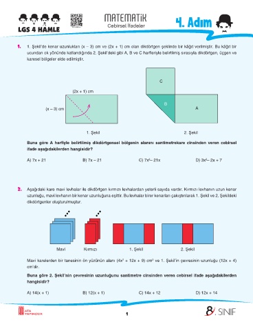 1. 1. Şekil’de kenar uzunlukları (x – 3) cm ve (2x + 1) cm olan dikdörtgen şeklinde bir kâğıt verilmiştir. Bu kâğıt bir