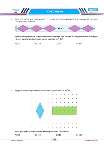 3. Alanı 1920 cm ve kısa kenar uzunluğu 12 cm olan dikdörtgenin içerisine 8 özdeş eşkenar dörtgen şekil-