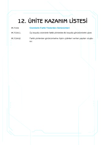 12. ÜNİTE KAZANIM LİSTESİ M.7.3.4. Cisimlerin Farklı Yönlerden Görünümleri M.7.3.4.1. Üç boyutlu cisimlerin farklı yönlerden iki boyutlu görünümlerini çizer. M.7.3.4.2. Farklı yönlerden görünümlerine ilişkin çizimleri verilen yapıları oluştu- rur.