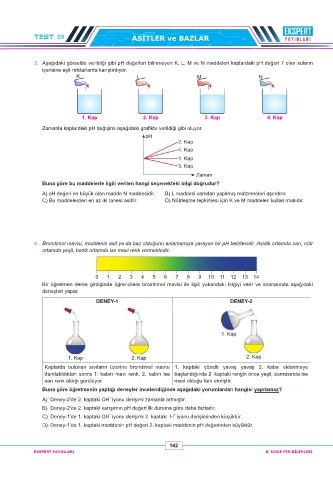3. Aşağıdaki görselde verildiği gibi pH değerleri bilinmeyen K, L, M ve N maddeleri kaplardaki pH değeri 7 olan suların