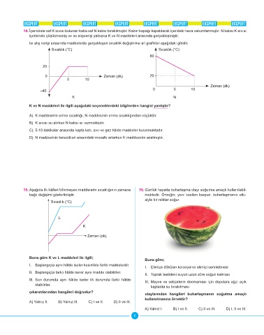 15. Aşağıda ilk hâlleri bilinmeyen maddelerin sıcaklığının zamana 16. Günlük hayatta buharlaşma olayı soğutma amaçlı kullanılabil-