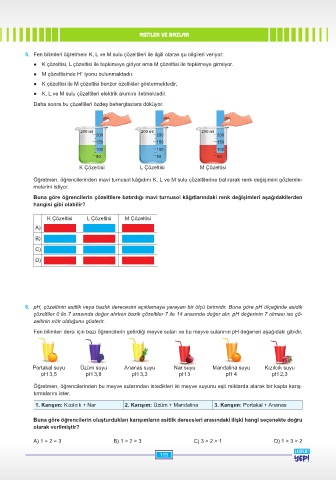 5. Fen bilimleri öğretmeni K, L ve M sulu çözeltileri ile ilgili olarak şu bilgileri veriyor:
