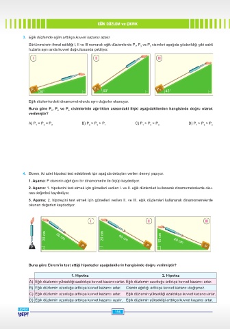 2. Aşama: 1. hipotezini test etmek için görselleri verilen I. ve II. eğik düzlemleri kullanarak dinamometrelerde oku-