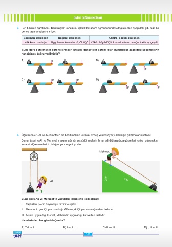 4. Öğretmenleri, Ali ve Mehmet’ten bir basit makine kurarak özdeş yükleri aynı yüksekliğe çıkarmalarını istiyor.