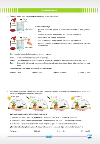 6. Fen bilimleri öğretmeni, Mehmet’den fotosentez konusu ile ilgili çeşitli düzenekler hazırlamasını istiyor. Bunun üze-
